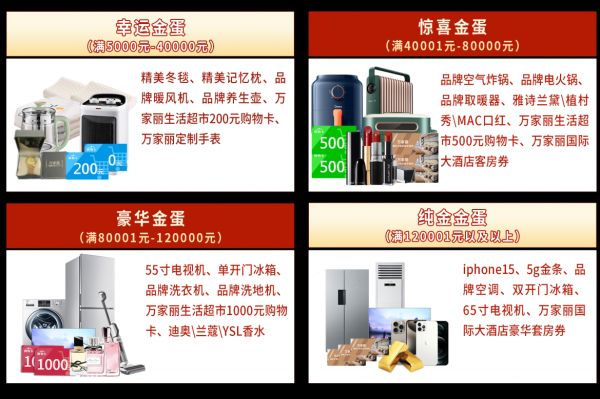 注:参与抽奖活动需加盖售后服务章的购物凭证与付款凭证,满8万以上需跨2个品牌方可参与抽奖。如高额金蛋区礼品抽取完毕,可顺延参与其他金额金蛋区抽奖,根据实付金额对应抽奖次数。