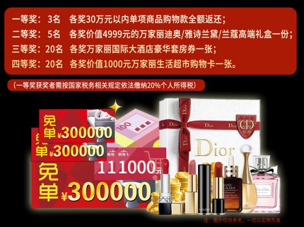 新年答谢,百里挑一。活动期间(2023年10月7日-2024年1月1日), 顾客在万家丽家居建材广场&家居生活广场任意门店下单,实付越高,奖励越多。截止1月1日24:00整,市场将对客户的单笔实付金额进行排名,总排名前100位的顾客可参与下单奖抽取。99个168元奖励名额,1个8888元奖励名额!