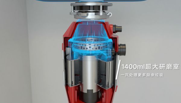 烹饪前处理后的边角材料冲洗进1400ML超大研磨室分批处理更显高效,轻松应对大容量厨余垃圾,让下厨者挥洒才情,肆意烹制丰盛美味