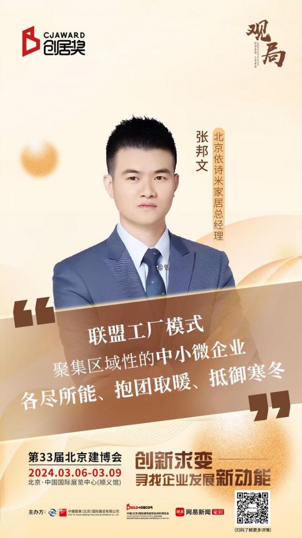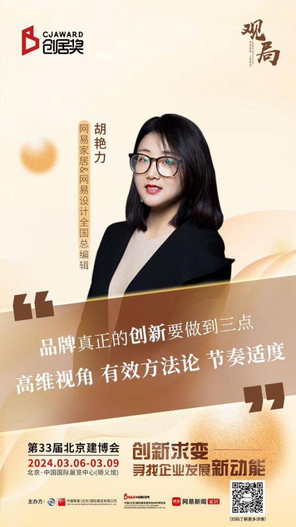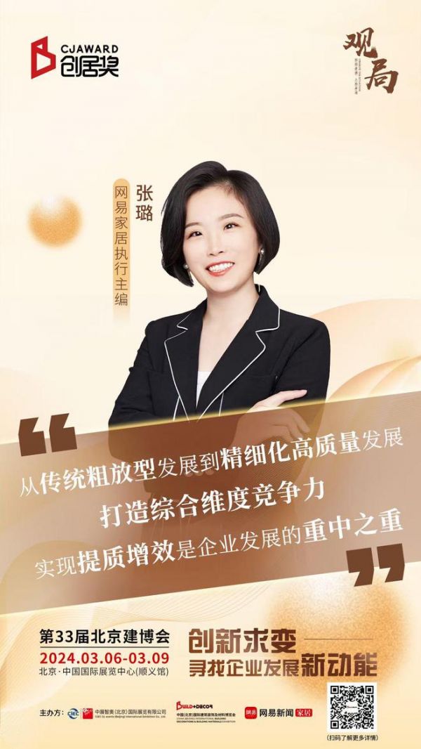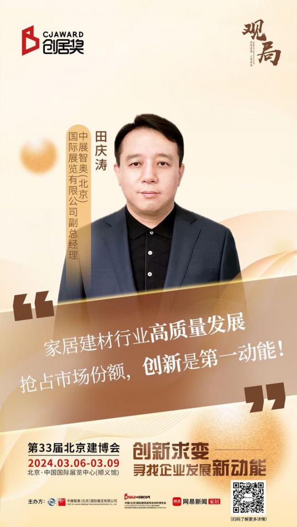 作为创居奖的联合主办方,中展智奥(北京)国际展览有限公司副总经理田庆涛在本次《观局》中致辞。他表示,面对消费需求升级、企业竞争加剧的大背景,赋能高质量发展,抢占市场份额,创新依然是第一动能。而这也是北京建博会携手网易家居推出创居奖的初衷所在,即聚焦行业多元创新趋势,推动行业高质量发展。同时,田庆涛也表示,2024年北京建博会也将发挥自身能量,推动产品、模式创新, 向全行业展现高质量发展浪潮中的强劲活力,以及大家居建筑装饰行业高增长的澎湃动力。