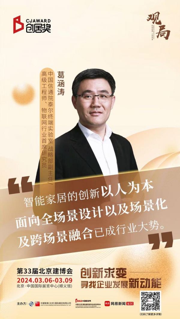 中国信通院泰尔终端实验室 战略部副主任/高级工程师、物联网行业首席研究员葛涵涛致力于智能化的发展研究,他表示,希望通过降低技术门槛,与装修设计师和装饰装璜行业合作,提供即插即用的智能化产品和服务。葛涵涛认为,智能家居的发展以人的需求为出发点,其核心目的是让人们过上更安全、舒适、简单、便捷的生活。而通过面向全场景设计的智能家居,不仅可以满足适老化改造需求,也可以为年轻人打造理想家居。葛涵涛表示,场景化及跨场景融合已经成为智能家居行业发展的必然趋势,能更好地满足不同人群在不同场景下的个性化需求,未来智能家居将为我们带来更加美好、便捷的生活。