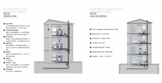 AQUATIZ阿克蒂思排水管道系统包括PVC双立管、HDPE单立管、PVC不降板同层排水系统、苏维托单立管排水系统,管道系统均采用沿墙走的形式,不占用高度空间,维修方便。所有排水管道最后通过多功能排水汇集器汇集,其中配置的大容量水封容积超过1000ml,只要有任意一个废水器具使用,便可以补充满整个水封,这样一来就可以杜绝传统排水的反漏问题。且用集成水封取代传统排水系统中最容易阻塞的U弯和P弯,降低了堵塞和排水不畅的风险,对于不喜欢麻烦的人们来说,AQUATIZ阿克蒂思排水系统无疑是一个不错的选择。