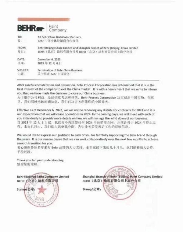12月6日,百色熊中国向全体经销商合作伙伴发布公开信,宣布将从2024年开始退出中国市场。百色熊涂料在信中表示: