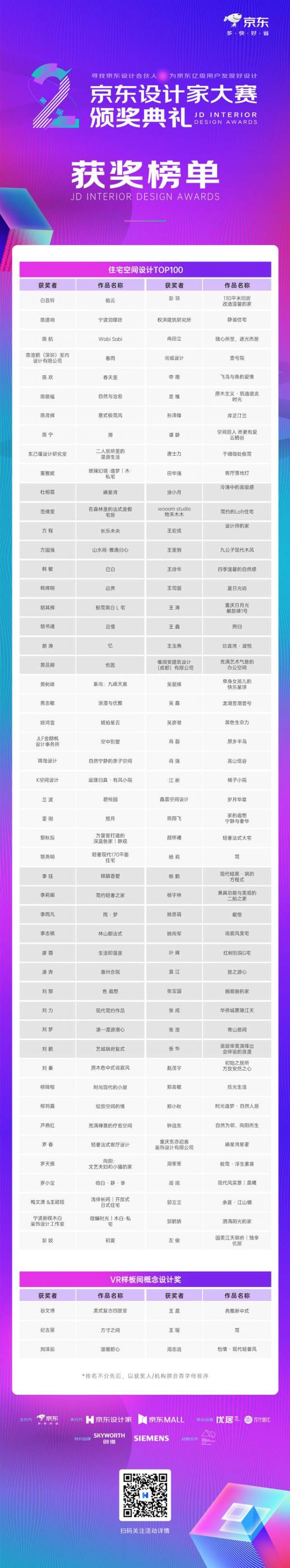 获得住宅空间设计TOP100的设计师,亦将获得本届京东设计家IP合作候选者资格。此外,京东设计家大赛 住宅空间设计冠军、亚军、季军,京东设计家大赛大奖 VR样板间概念设计奖,将在颁奖典礼现场荣耀颁授,共享年度高光时刻。