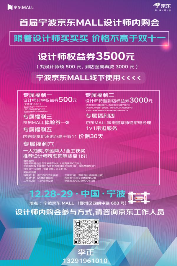 为了更好地满足设计师们对家电家居供应链的诉求,特此在第二届京东设计家大赛颁奖典礼之际,12月28日至29日在宁波举办了首届京东MALL设计师内购会,重磅推出设计师专享直补3500元、大奖随心抽等六大设计师专属福利,赋能设计师及业主,家电家居好货一网打尽,省钱省心一步到位。