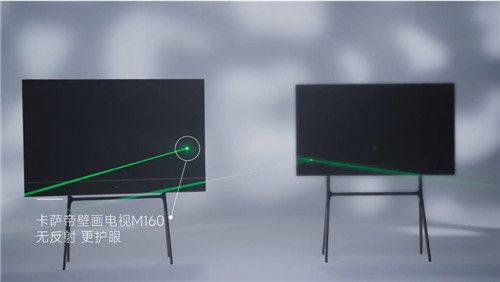 在视频中,工作人员将两台激光笔摆放到合适位置后,同时打开投射在卡萨帝电视和普通4K电视屏幕上,随后发现,卡萨帝电视屏幕由于有多重反射涂层,并没有反射激光,不受强光干扰;而普通4K电视激光反射明显,一部分光经过电视屏幕折射或者反射一部分光回来,容易产生眩光引起眼睛疲劳。