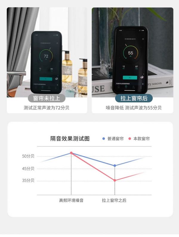 令人惊喜的是,爱漫时睡眠窗帘《臻悦19》系列还拥有优异的隔音性能。在测评中,原本室内能够听到的窗外车辆行驶、高声喧闹的声音,测量声波为72分贝;在窗帘拉上之后非常明显这些恼人的噪音都消失了,家居环境瞬间变得安静,经测量,室内噪音达到了55分贝,隔音降噪效果明显。