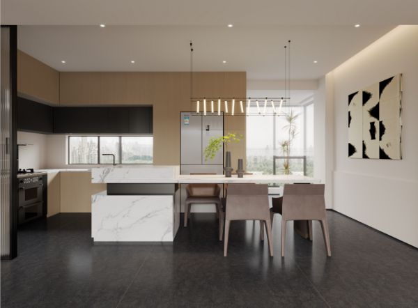 宽阔明亮的空间可以为我们带来心灵上的释放,开放式的厨房,让家的温馨感更加浓厚,原木风橱柜与白色的奢石岛台组成最强CP,既显沉稳又显高级操作分区明确,合理的动线节省做家务的时间,赋予了厨房更多的可能性。