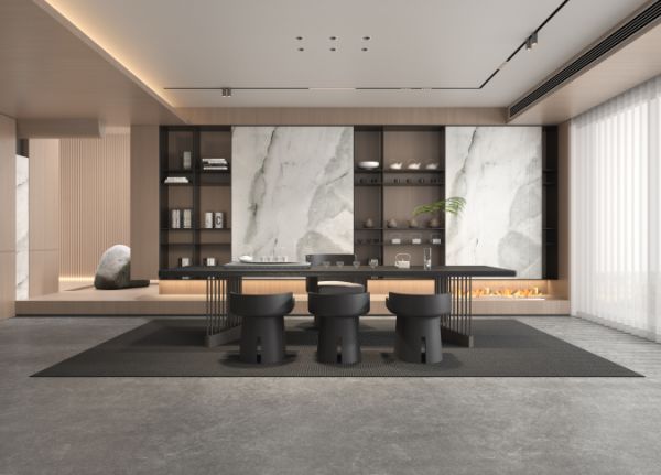 通过精工奢石和纯粹的色彩创造出自然的效果,白色精工奢石与黑色的茶桌相互搭配,高级又时髦!茶室没有太复杂的设计,也没有繁重的家具,让空间更通透敞亮。