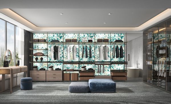 衣帽间采用透光奢石设计,厚重与清透的感受相互融合,隐藏式灯带与绿色奢石形成和谐互补。卫生间色调搭配简约优雅,精工奢石材质为室内增添了温暖和深度,干湿分离则营造出一种层次分明的感受,这些元素以一种灵动而舒适的方式将空间连接起来。