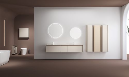 Iridi伊瑞迪系列定制浴室柜,不仅在颜色上与轻奢主义相融合,还在其他方面与这股流行风潮有着共性。Iridi伊瑞迪系列定制浴室柜打破了传统的直角设计,以圆形的卫浴镜增加了卫浴空间的柔和感和美感。它的柜门还采用了无拉手的设计,更显精致和干净。其定制柜门配有软关闭系统,可以避免柜门的撞击和噪音,在细节之处尽显设计师的贴心关怀。