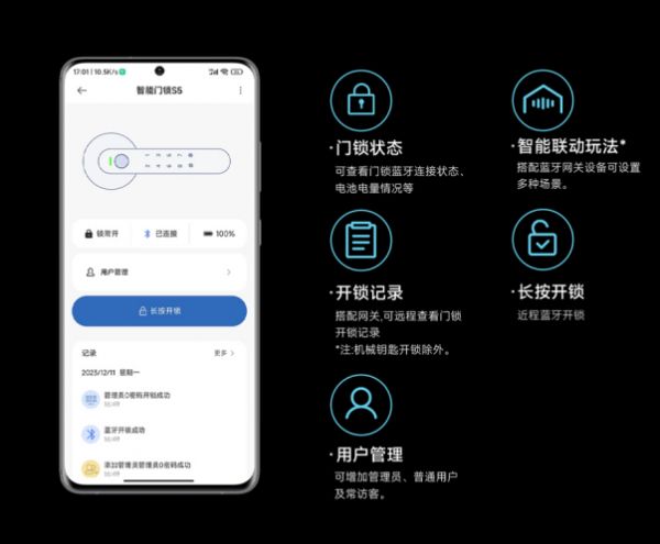 12月28日10点智能房门锁S5将正式上线小米有品众筹,产品外观精巧简约,通过米家APP一站式管理,可以实现远程查看开锁日志、常开模式设置、米家生态互联等丰富功能。