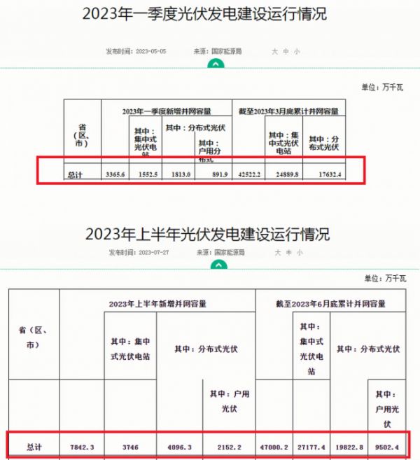 从国家能源局官网查看得知光伏发电建设和运行情况。2023年前三季度,全国光伏新增装机12894万千瓦,同比增长145%,其中集中式光伏6180万千瓦,分布式光伏6714万千瓦。截至2023年9月底,全国光伏发电装机容量达到5.2亿千瓦,其中集中式光伏2.95亿千瓦,分布式光伏2.25亿千瓦。2023年前三季度,全国光伏发电量4369亿千瓦时,同比增长33%。全国光伏发电利用率98.3%,同比提升0.3个百分点。