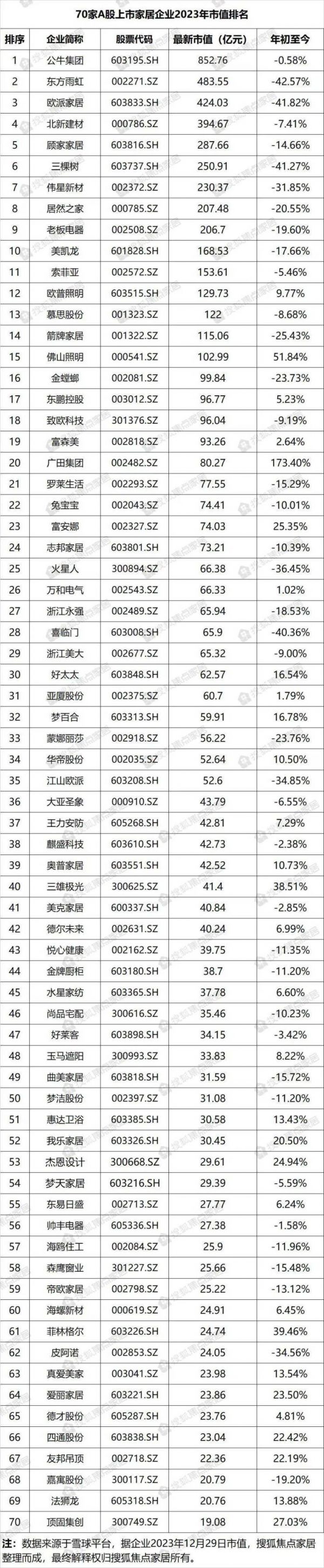 截至2023年12月29日股市收盘,据70家A股上市家居企业市值表现,搜狐焦点家居特梳理出“70家A股上市家居企业2023年市值排名”排行榜。