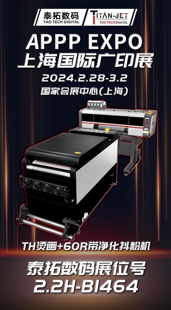迪培思广州展会结束之后泰拓数码将闪现上海国际广印展,2024 APPPEXPO上海国际广印展将于2024年2月28日-3月2日在国家会展中心(上海)举办!作为广告、标识、印刷、包装行业和相关产业链极具影响力的国际专业品牌展会,APPPEXPO上海国际广印展自1993年开办以来,始终致力于打造国际产业开放、合作、交流的窗口和舞台,并充分发挥全球广印行业最新应用成果展示交流交易的进出口平台属性,引领全球广印产业链提质升级。