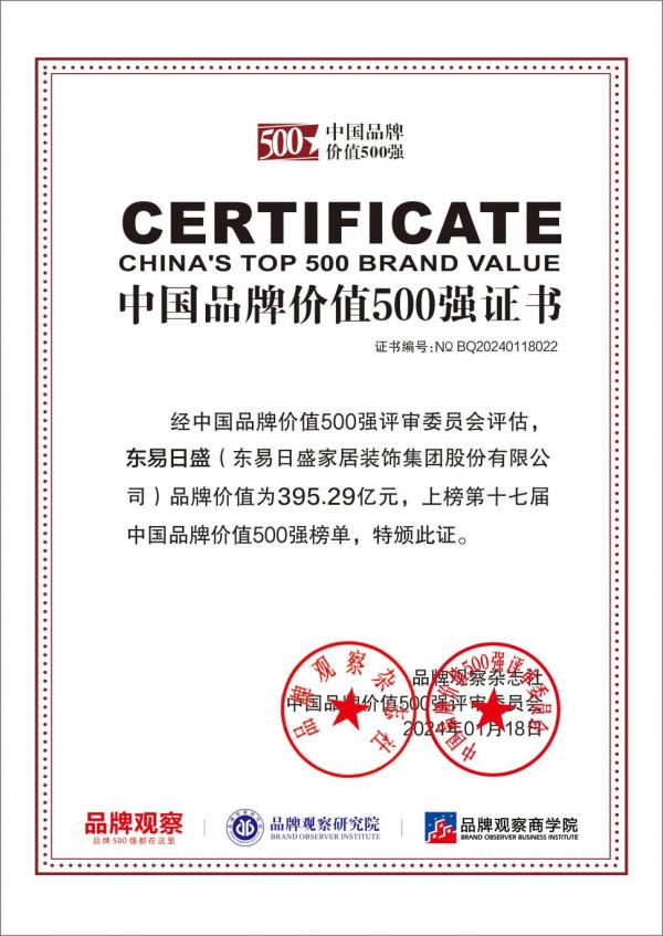 东易日盛作为家装行业引领者,多年来与行业共生,持续为行业指明前进方向。2023年东易日盛连续多年上榜《中国品牌价值500强》,不仅是中国品牌权威平台对东易日盛的肯定,也是行业和消费者对东易日盛的高度认可。