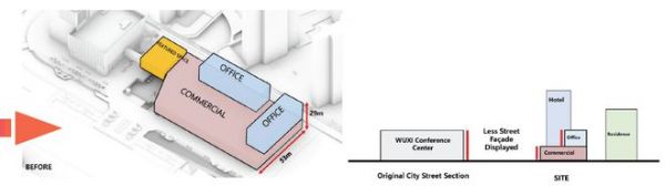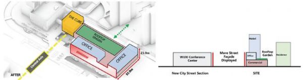 设计团队在无锡国际会议中心、CBD商务中心和湿地公园的中轴线上,设置魔方主题馆,并通过增加主题馆高度来更好地呼应具区路对侧建筑群体体量关系,形成本项目兼具独特形象特征和多功能性的记忆点。同时,通过镜像调整策略,设计团队将原东侧的写字楼移动至西侧,不仅改善了城市主要道路界面的尺度关系、为周边住宅提供更好的日照和景观环境,并加强了自身的沿街可达与可视性、扩大了商业基底面积、将项目整体控制为多层建筑。如此一来,既改良了城市公共空间品质,又降低了项目实施难度,增加了使用效率,提升了项目本身及相关物业的整体价值。
