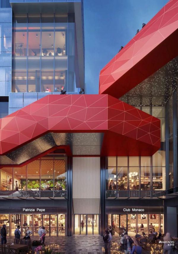 红色悬桥从地面延绵至上,环绕于商业裙楼二层的庭院,向上盘升与三层屋顶花园相连。二层庭院作为室内商业空间的延申,提供商业外摆空间、临时性商业活动空间为尺度有限的室内商业空间提供拓展性;其探出建筑主体轮廓的形象,发挥“窗口”般的作用,吸引着消费者进入商业裙楼,深入探索商业空间的更多可能。这一设计打破了单一平面的局限,塑造了动态的立体交通流线,优化了商业动线的流畅性。同时,在人流路径中打造商业场景,创造了更多商业机会。
