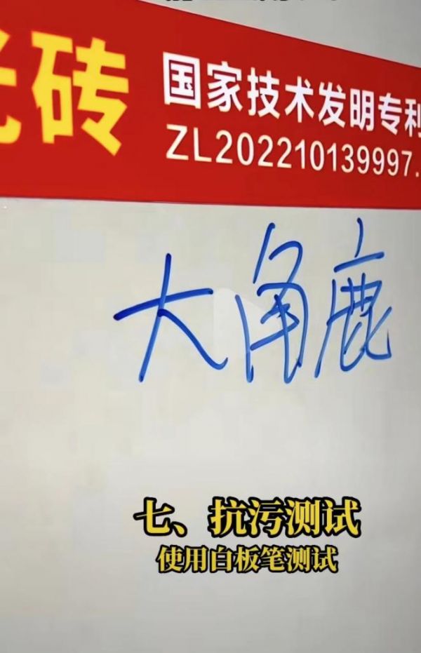 小编用白板笔在瓷砖表面写下了“大角鹿”三个字,过了几分钟后,用纸巾轻轻一擦,瓷砖上的字迹立刻消失,表面光洁透亮。再次说明,大角鹿超耐磨瓷砖的抗污性强,也非常容易进行清洁,可以说是给消费者吃了一颗定心丸。