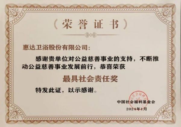 本次荣获“最具社会责任奖”荣誉,既是对过去努力的认可,更是对未来责任的鞭策。未来,惠达卫浴将继续积极参与更多的社会公益项目,践行企业担当,关爱社会、造福社会、回馈社会,用实际行动为中国公益事业做出更多贡献。
