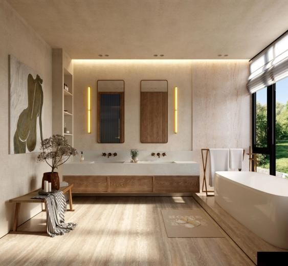 与其他风格不同,北欧风更注重舒适和实用性,整个卫浴空间以米黄色作为主色调,卫浴台面选择素雅而柔软的米白色,材质的肌理更加清晰地呈现出来,为空间带来温暖与活力,大大的落地窗提升空间通透感,透过玻璃仿佛拥抱着温暖的阳光,将整个空间渲染成一片温馨与宁静的氛围。