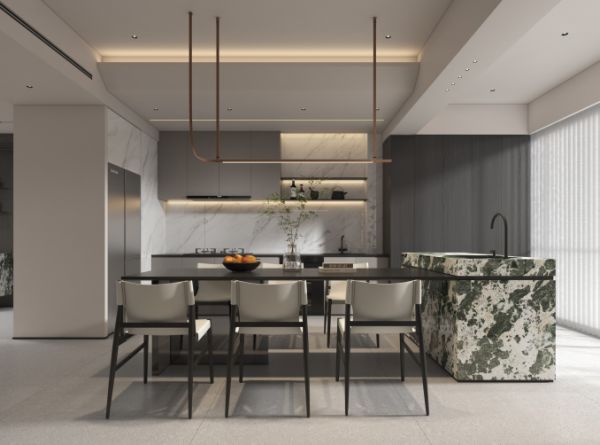 沙发背后设计了开放式餐厨区,不仅在视觉上起到扩容的效果,亦增加了空间的互动感。此刻家是一片背景板,又是生活的主场景,演绎生活的居住者才是第一主角,奢石、木质、皮革彼此呼应,文雅艺术的家具,深浅交织,凸显空间的层次感,与绿色奢石岛台细节处的质感,形成松弛有度的微妙平衡,一同营造现代简约美学。