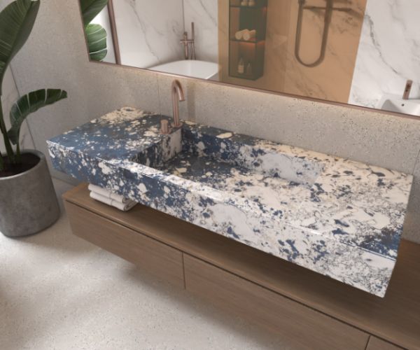 衣帽间,整体延续简约的基调,场景中暗藏的细节显露,让空间叙事坚定而有力量,色彩点缀是赋予空间灵魂的重要部分,蓝色中岛柜的台面与白色奢石墙面形成呼应,让衣帽间富有仪式的艺术感。卫浴空间更强调简约的形象,利用蓝色奢石洗手台作为点缀首先进入人们的眼帘,整体空间设计给人含蓄内敛,细微寻常的布景都充满意境,以不同的层面表达居家的静好魅力。