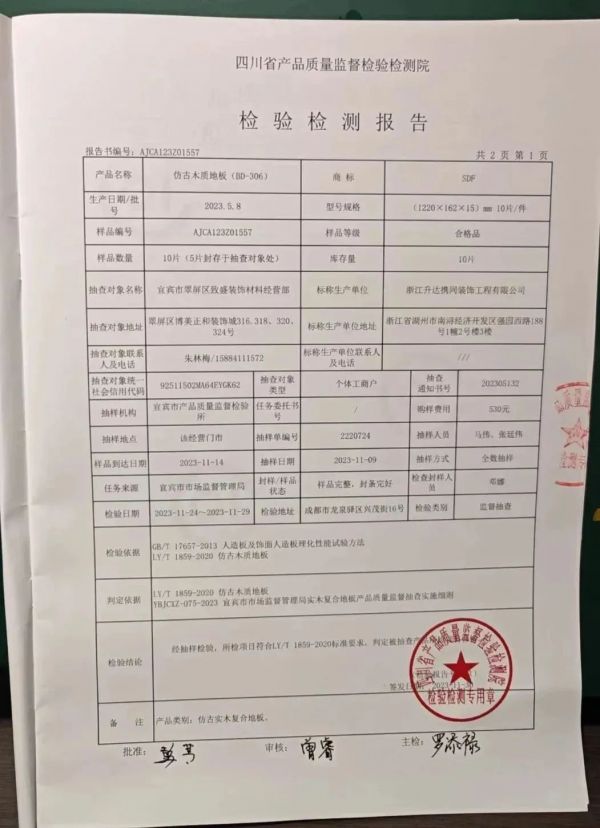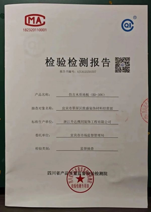 近日,四川省宜宾市市场监督管理局于升达地板宜宾门店购买实木复合油漆面木地板后抽检,检验结果显示均为合格产品,符合国家现行行业标准。