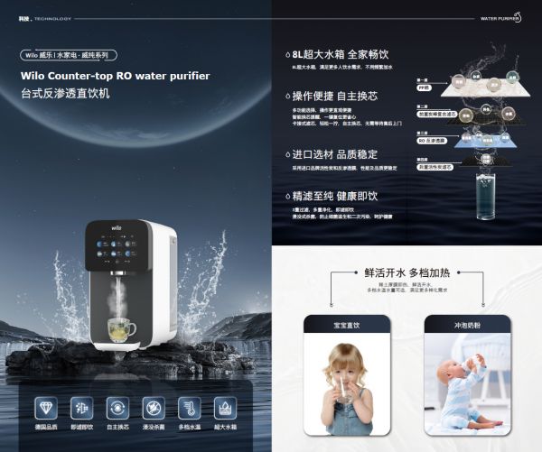 除以上两类产品外,威乐此次还上市了厨下式反渗透净水机和台式反渗透直饮机,其中,厨下式反渗透净水机又根据不同的设备参数和使用需求分为“标准款”,“高级款”和“旗舰款”。这些产品在外观上均以白色为主,简约自然。在功能上,威乐厨下式反渗透净水机标准款和高级款均可以实现两种水质出水,用水饮水都无忧,而旗舰款则可以实现热水出水。威乐台式反渗透直饮机能够实现多档加热,即出即饮,饮水不再等待。