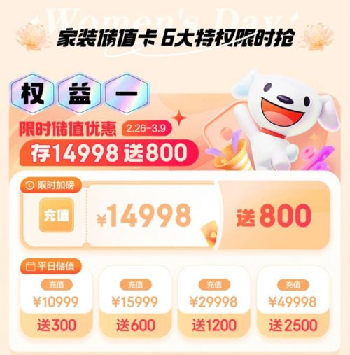 除了单件直降的极致性价比,考虑到部分消费者有整体装修焕新的多件购买需求,京东家装开工季还推出了储值膨胀的折上折福利。消费者在京东APP开启家装储值卡后,可以限时享受存14998元送800元、存49998元送2500元等超值优惠,使用储值卡下单,相当于在商品已有优惠价上再降5%,让家装预算一减再减。除了储值优惠,开卡用户还可以获取100元购物津贴、储值下单即返500京豆、连领3个月白条免息券、超级导购1V1服务等权益,进一步升级购物体验。此外,美心木门1元抵2000元现金、东鹏瓷砖1元抵3998元大礼包、金牌橱柜1元享1888元服务礼包等大牌1元权益,也为消费者带来了更优化的预算方案。