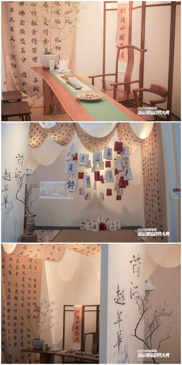 在大典“2024中国家居潮流设计区”,由设计师金清华和吴冰共创的设计秀《渡》吸引了众多观众驻足。设计师将传统的茶文化与现代设计完美融合,创造出一个既具有东方美学又不失现代感的品茗环境。以“渡”为引导,作品将观众带入一个跨越界限、探索未知的旅程。空间整体设计上,《渡》采取了传统跟现代融合的表达手法,特别以胡桃木的家居来呈现,通过贴近自然,达到天人合一的境界;整体以帷幔的形式书法卷轴倾泻而下,仿佛就是李白的诗篇从天而降,营造银河落九天的味道,希望给人一种特别的浪漫。