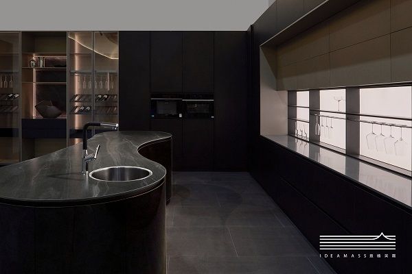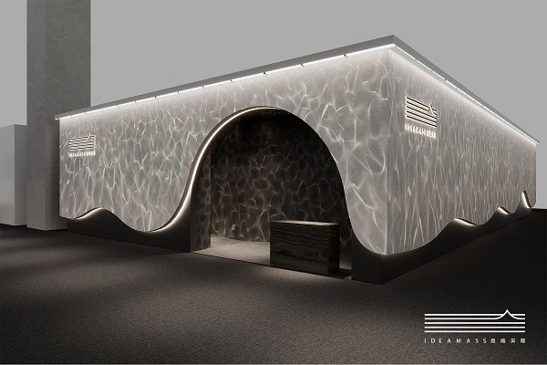 而本次意德美嘉就以水的流动韵律为灵感,打造了一场为期三日的品牌“观水“盛宴。自进入序厅起,仿佛步入一处水帘洞景,灯光效果巧妙营造出一种被水环抱的氛围,引导观者逐步沉浸于水元素所营造的独特气息之中。展区内,产品设计巧妙结合了弧形造型与水光叠影,不仅在形态上追求美感,更在神韵上寻求共鸣。通过艺术玻璃、发光背板、科技木皮等材料的运用,描绘出水的光影效果。