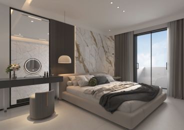 卧室整体设计精致而考究,在材质上,通常选择高级的奢石、实木等材料,突出空间的现代感和高端氛围,流畅的曲线消除了方向感,予人安谧的视觉享受及现代简约气韵的蔓延滋长,在突出品质感与细节处理的同时,注重色彩与造型的渲染。
