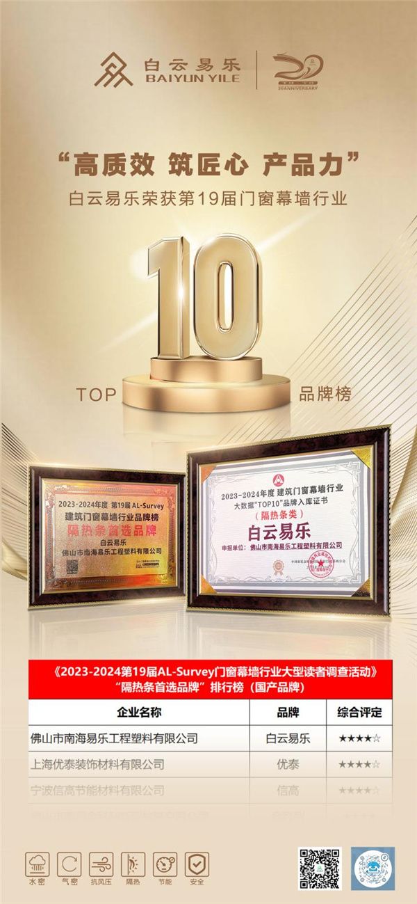 白云易乐荣获第19届门窗幕墙行业top 10品牌榜