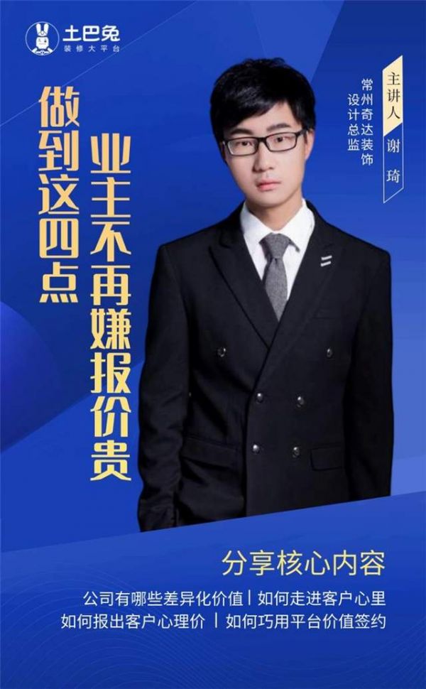 近日,土巴兔龙年第一期“兔友约·大咖说”上线,常州奇达装饰设计有限公司设计总监谢琦分享四点秘籍,快速拉近设计师和装修业主的距离,助力设计师快速签单。