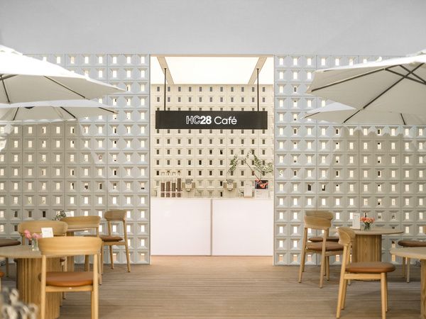 展厅内部空间用简单通透的隔断作为分割,将空间划分为三大区域,左右两侧分别是由都汇里和HC28打造的不同风格生活场景,都汇里大胆现代,HC28安静诗意。链接这两种截然不同风格生活场景的,是这次特别打造的户外咖啡厅。