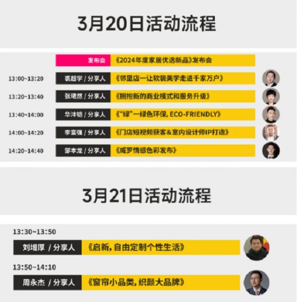 3月20日下午,领绣北大区总经理裘超学分享《邻里店—让软装美学走进千家万户》、布奇渠道负责人张珺然分享《拥抱新的商业模式和服务升级》、宝格绿首席执行官华沣铠分享《“绿”一绿色环保,Eco-Friendly》、德莱美运营总监李富强分享《门店短视频获客&室内设计师IP打造》、威罗中国区总裁邹本龙分享《威罗情感色彩发布》。3月21日下午,大卫北京公司总经理刘增厚分享《启新,自由定制个性生活》、织颜创始人周永杰分享《窗帘小品类,织颜大品牌》。
