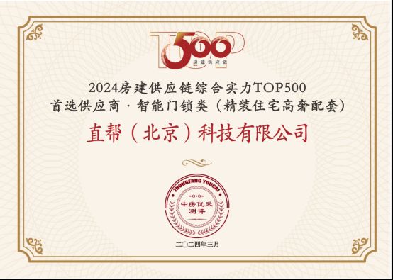 2024年3月20日,中房优采平台正式发布《2024房建供应链企业综合实力TOP500-首选供应商服务商品牌测评研究报告》(以下简称“报告”)。根据评测报告,直帮凭借卓越的产品品质、优秀的品牌管理和完善的客户服务体系,成功赢得了中国房地产业协会的认可,荣登中国房地产开发企业综合实力TOP500智能门锁类精装住宅高奢配套供应商品牌首选率榜首。