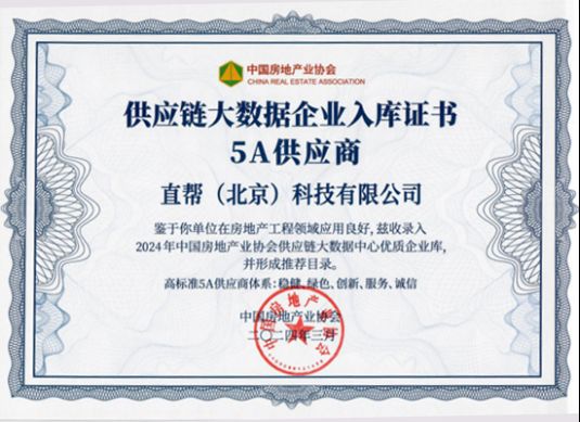 除智能锁门类行业奖项,直帮科技还凭借其卓越的综合实力,荣登2024年中国房地产业协会供应链大数据中心5A供应商企业库。5A标准涵盖了生产力、产品力、服务力、交付力、创新力五大维度,充分展现了直帮科技在工程市场的杰出表现,并得到了行业权威的广泛认可。