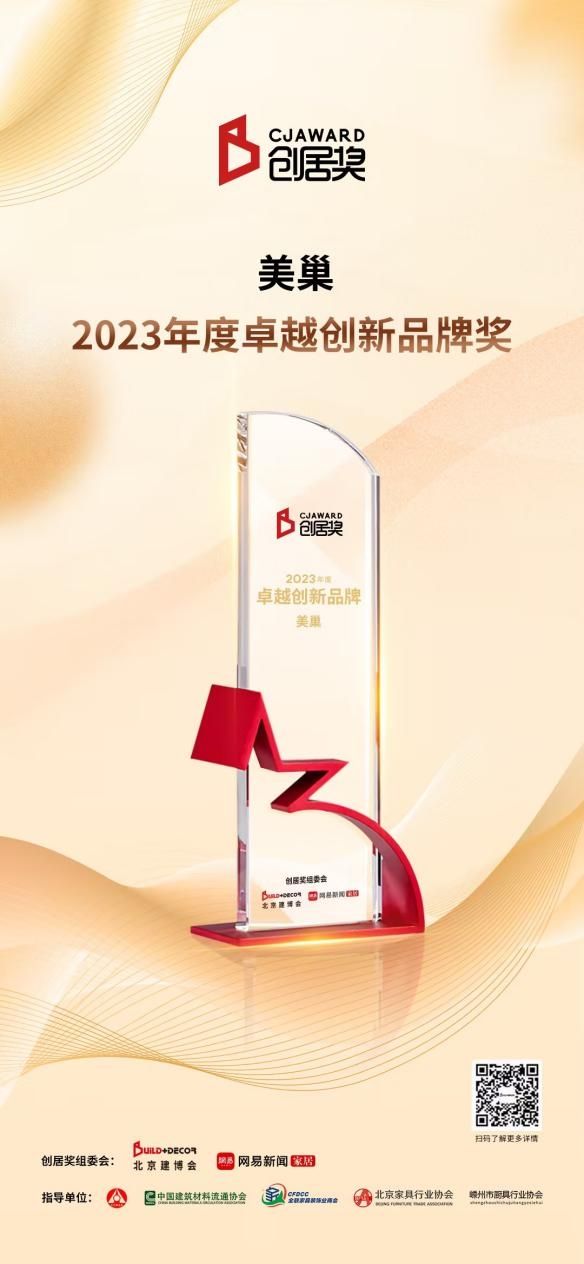 据了解,首届“创居奖”于2023年9月开始启动,由各符合条件的品牌进行自荐或相关单位引荐的方式进行参与,经过初审入围、专家评选、获奖名单公示等阶段的严格审核,最终于今年北京建博会上予以表彰。美巢凭借着强大的品牌商誉、产品力、创新能力、环保属性以及对于行业发展的带动,获得了业内专家评审及权威媒体的主动引荐,并最终获评“2023年度卓越创新品牌”殊荣。