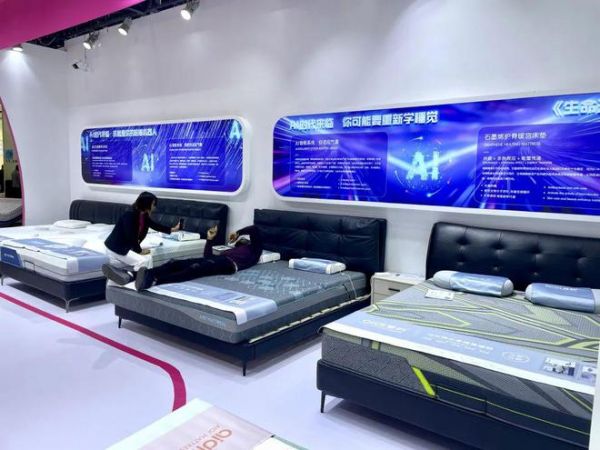 AI床垫展示区:AI时代来临,床就是你的陪睡机器人。爱的带来了远红外舒腰牵引床垫,一款可以深度缓解腰椎压力的助棉智能床垫,设三大舒腰模式,银膜远红外腰部热敷促进血液循环,按键APP双重智能;另一款AI智能系列深度自适应气囊,左右两边独立6气囊,通过AI感知系统,AI智能调节系统,AI智能健康检测系统,深度提升睡眠质量。