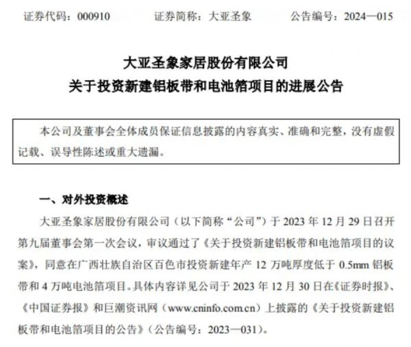 2024年4月7日晚间,大亚圣象(000910.SZ)公告称,2024年4月3日,公司和百色市人民政府签署了《大亚圣象年产12万吨厚度低于0.5mm铝板带和 4 万吨电池箔项目投资协议》。公告显示,项目选址于百色新山铝产业示范园区,占地300亩(以最终土地出让面积为准),总投资约21亿元。项目建设期约20个月。项目建成投产后,将形成年产12万吨厚度低于0.5mm电池箔坯料(铝板带),以及4万吨电池箔,该项目或将为大亚圣象带来新的利润增长点。