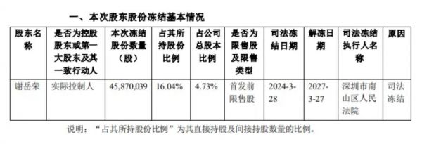 4月2日,箭牌家居(001322.SZ)公告称,近日公司股东、实际控制人谢岳荣先生所持有的公司4587万股股份被冻结,占其所持股份的16.04%。公告称,该司法冻结事项不会对公司日常经营产生重大影响,不会导致箭牌家居的实际控制权发生变更,不会对公司治理结构产生重大影响。