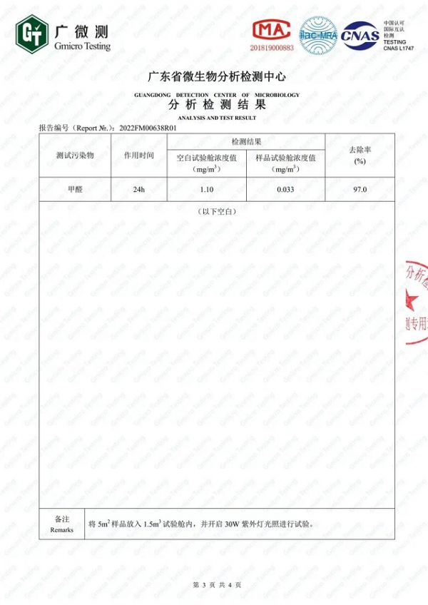 广东省微生物分析检测中心出具雅琪诺除醛窗帘除醛报告