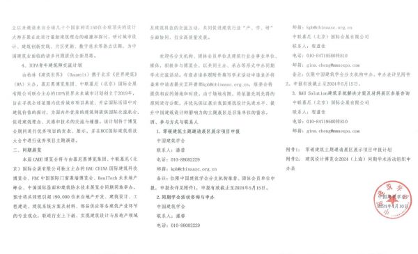 围绕“更生· 筑新”年度主题,本届CADE主题邀请展将拟定“好房子”和“零碳建筑”两大主题,其中“好房子”主题邀请展区将由我会居住建筑专业委员会组织,邀请中国建筑标准设计研究院担任总召集单位;“零碳建筑”主题邀请展区,将于即日起至2024年5月15日,面向我会团体会员单位正式启动展示项目征集,欢迎各团体会员单位积极参与,详情请参见附件1。