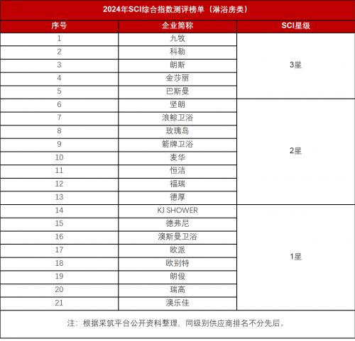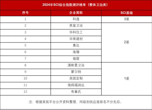 近日,B2B建材采购交易平台“采筑”公布了2024年SCI综合指数测评榜单。与首届SCI相比,测评品类数量增加了30%,供应商数量增长了50%,测评范围也拓展到了相关的经销商和安装商。数据覆盖了4500+家工厂审厂报告、500000+份产品检测报告以及14000+亿元的累计交易数据,全面展现了行业内各供应商的竞争力和市场表现。