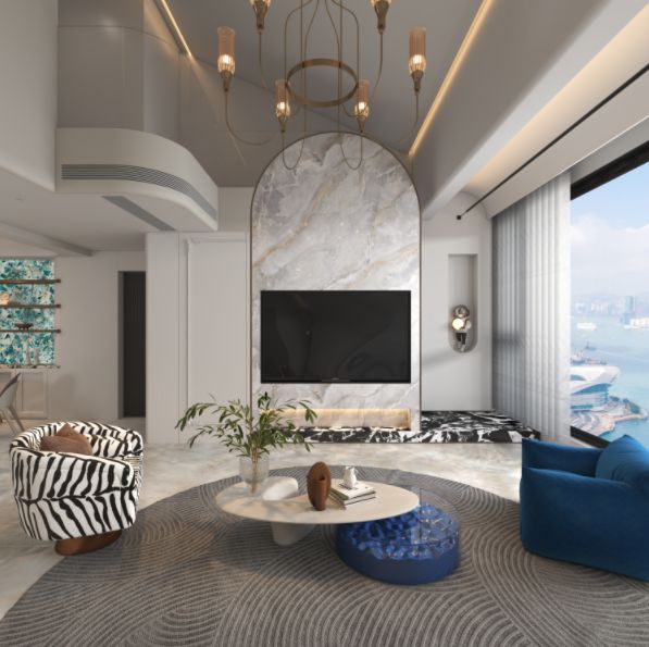 撷取温柔奶油色作为整体色调,营造法式高级质感柔和温馨的小资情调,墙面定制的拱门奢石墙,弱化空间的方正感与流畅性,精致的吊灯结合黑白奢石地台,法式雕花搭配奢石地面通铺打造一个现代法式的空间基调。