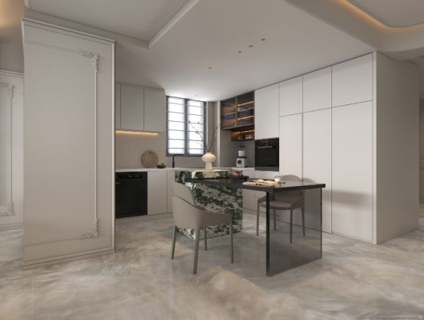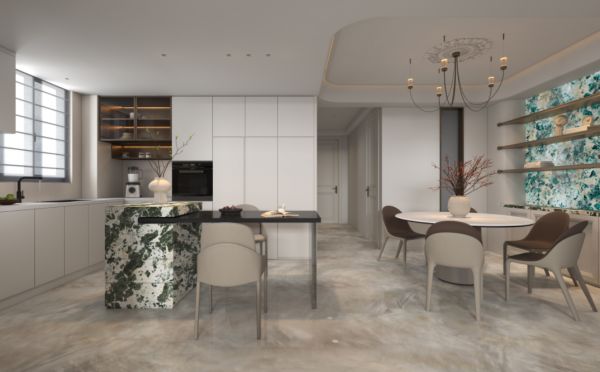 空间都有自己的语言,开放式客餐一体,使得空间相互呼应又各自独立。绿色水吧中岛台展现奢石美感,餐桌的透光奢是设计让空间多了灵动性和趣味性。西厨设计各种功能分区完备,定制柜体将日常三餐过成浪漫的法国电影。