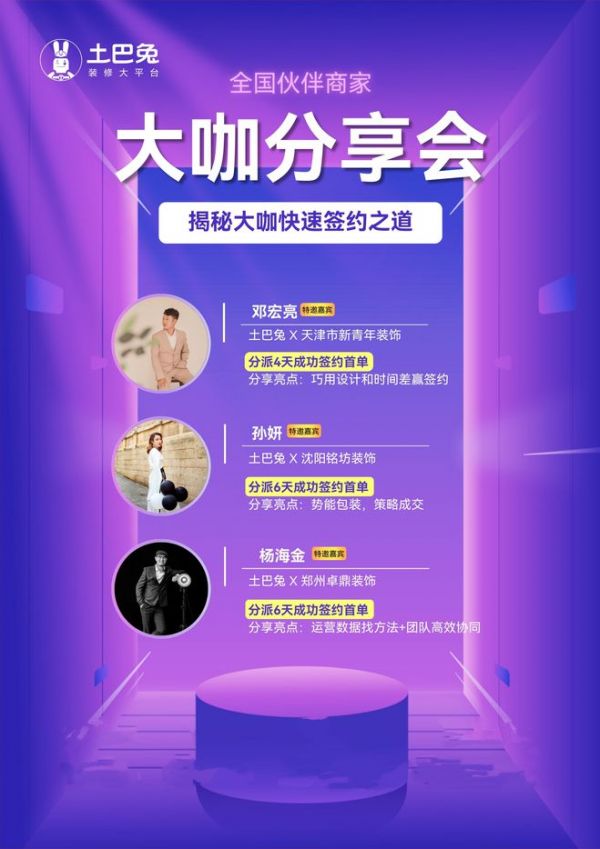 当天做客土巴兔大咖说直播间的三位优秀设计师,分别是来自沈阳铭坊装饰设计总监孙妍、天津新青年装饰创始人邓宏亮、河南卓鼎装饰创始人杨海金。他们均在与土巴兔建立合作之后6天内就完成了首单签约。
