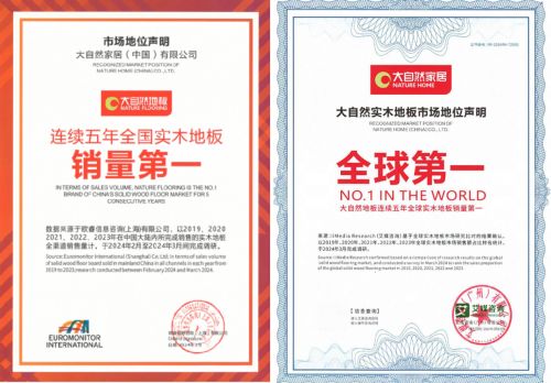 大自然家居全球布局9大原材料供应基地和6大集约化智造基地,为未来地板、木门、橱柜、衣柜以及整家定制等产品的产能做出了精心布局,投入集约化、智能化、自动化、信息化的高水平生产基地的建设,助推中国健康家居行业的发展。2024年3月,全球优秀的权威机构欧睿咨询和艾媒咨询分别发布统计数据,表明大自然实木地板在2019年至2023年连续五年蝉联“全国实木地板销量第一”和“全球实木地板销量第一”的荣誉,展现了大自然家居在国内外市场的强劲实力。